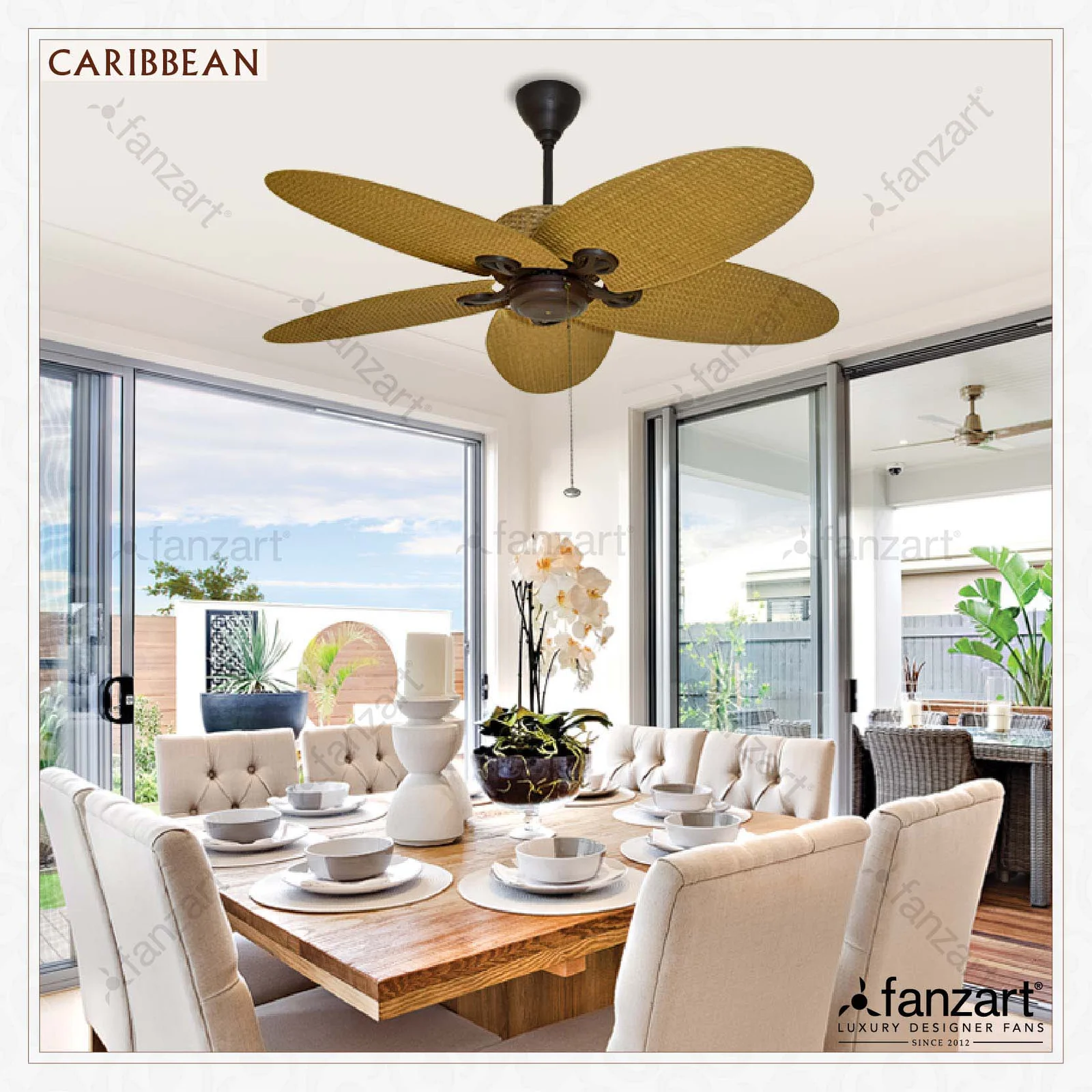 Admirers are often at a loss to determine what makes the Caribbean so special. The coffee brown housing in combination with the 5 ABS blades finished with natural rattan look is the perfect choice for tropical style. The natural look and feel of the fan combined with the pull chain mechanism add a touch of vintage to this beauty. The 52 inch designer fan is equipped with the Summer Winter feature, bi-directional rotation. Yes, be it Summer or Winter we have the Caribbean to keep you cool and cozy. The Caribbean is perfect to adorn the ceiling of balcony Terrace, Garden, Outdoor-Terrace, Villa Properties as well as tropical themed living rooms.