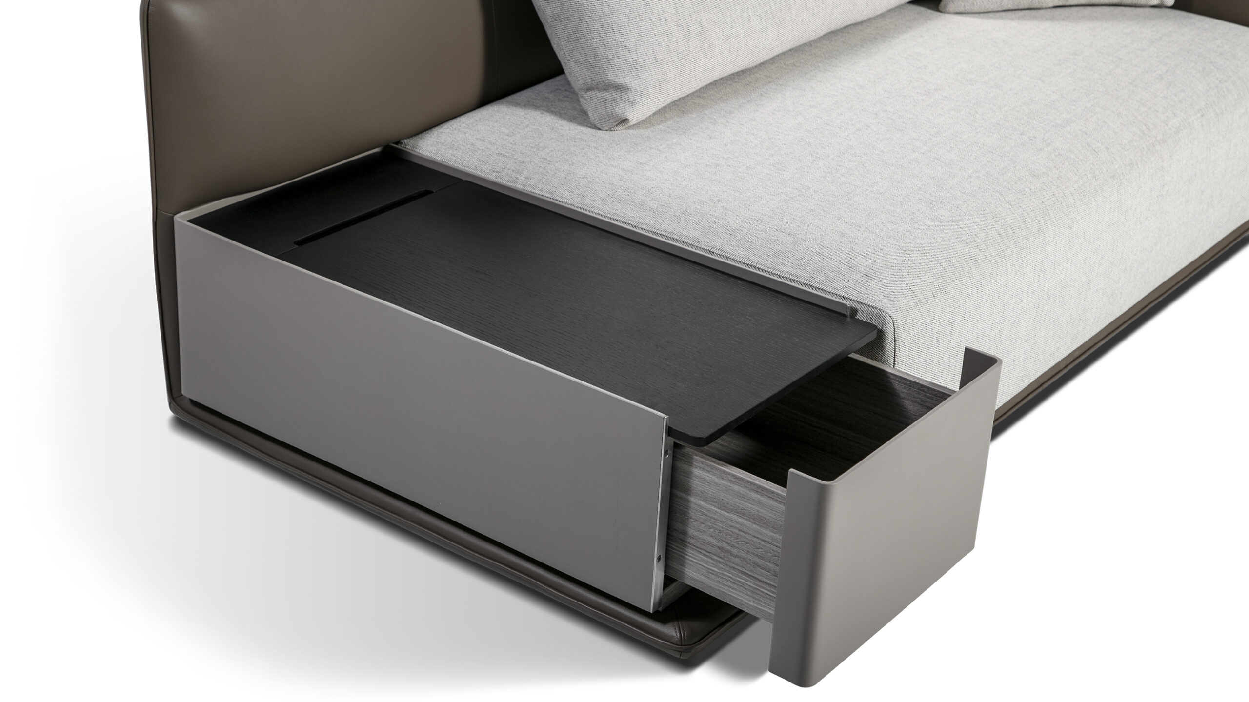 Modern and modular, the Elan (New) scales seamlessly from small apartments to expansive lobbies, providing impactful design no matter the size. Coupled with the series’ signature, (optional), two-toned upholstery, the Elan’s flexible components allow for much customization in configuration. Nestling in the built-in faux leather wrapped wooden table with soft-close drawer, between tight fitted fiber topped high-resilient foam seats, the Elan Sofa instantly becomes as practical as it is striking. Available in sofa and sectional configurations with your choice of fabric (removable) or leather upholstery.
