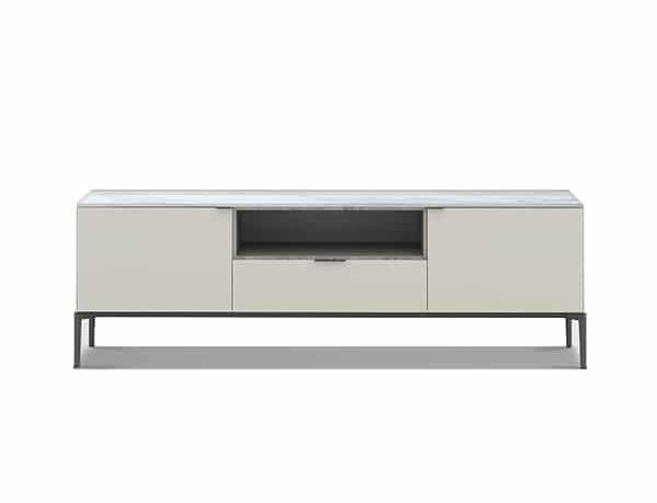 With its signature uplifting base design and sleek drawer handles, the Matrix collection offers an expansive range of functional storage options.  From sleek marble selections to matching matte lacquer options, an array of top surface options are available in the line-up. Some variations of the Matrix series is also available in stunning two-tone design, combining matte lacquer colors with Graphite Oak on a single structure. The Matrix Media Cabinet (High Base) is an eye-catcher visually and highly usable functionally.