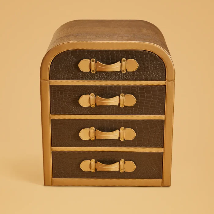Introducing our unique Mid-Century collections’ Genuine Leather Chest of Drawers in brown croco embossed leather paired with front trims and handles in top grain camel coloured leather. A luxurious addition to your home. This chest features four spacious drawers, offering both style and functionality for your storage needs. It can be used as an individual unit or paired up with your study table, either way it helps help you organise better.