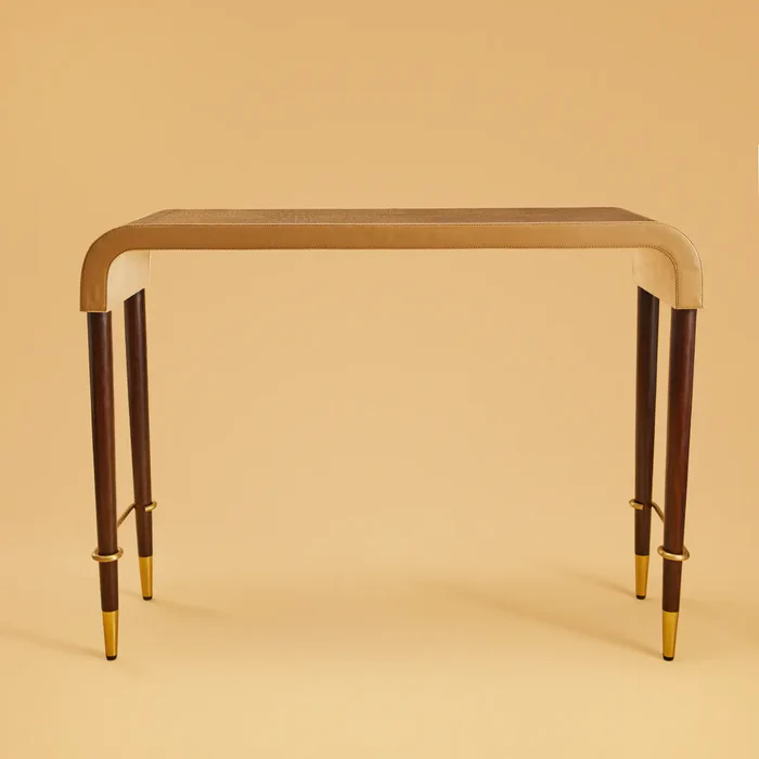 Introducing our Mid-Century Leather Console – a true embodiment of craftsmanship and elegance. Handcrafted with a fusion of rich brown croco embossed leather and top grain camel-coloured leather, this side console represents timeless artistry and refined aesthetics.