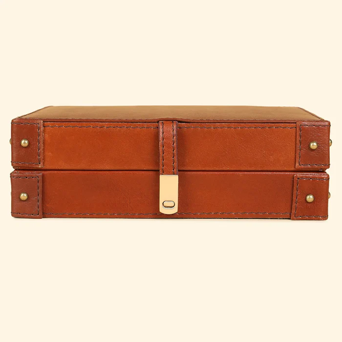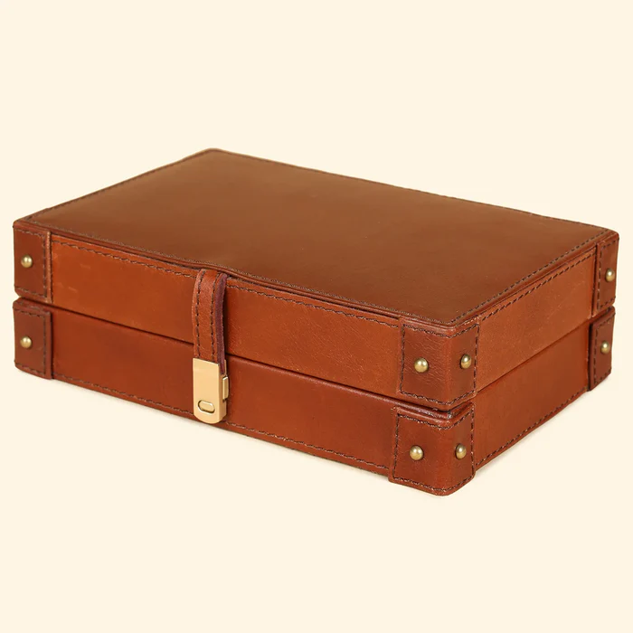 Introducing our exquisite handcrafted playing card box, a perfect Diwali gift choice this season. This designer box boasts a luxurious exterior adorned with genuine leather, featuring intricate stitched leather trims and metal rivets that grace the sides.