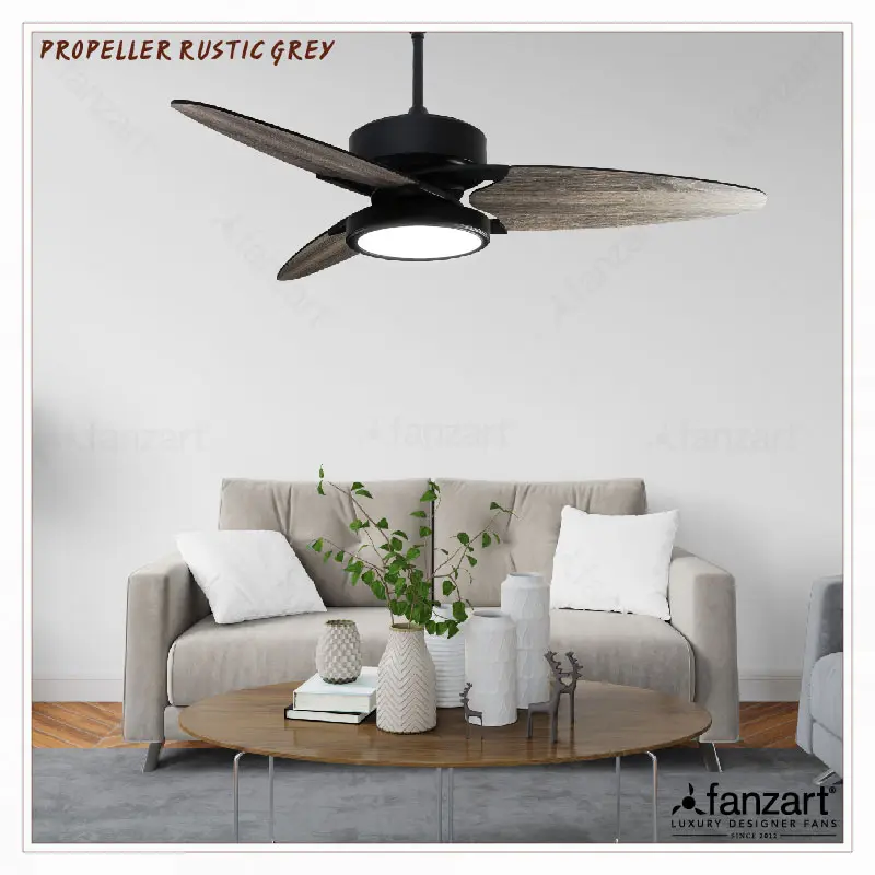 This Propellor fanzart fan is remote controlled, equipped with an 18W Multi colored LED Light kit, and is specially treated with 3 reversible plywood blades. The matte black/rustic grey color tones can decorate the interior space with the appeal you’d prefer.